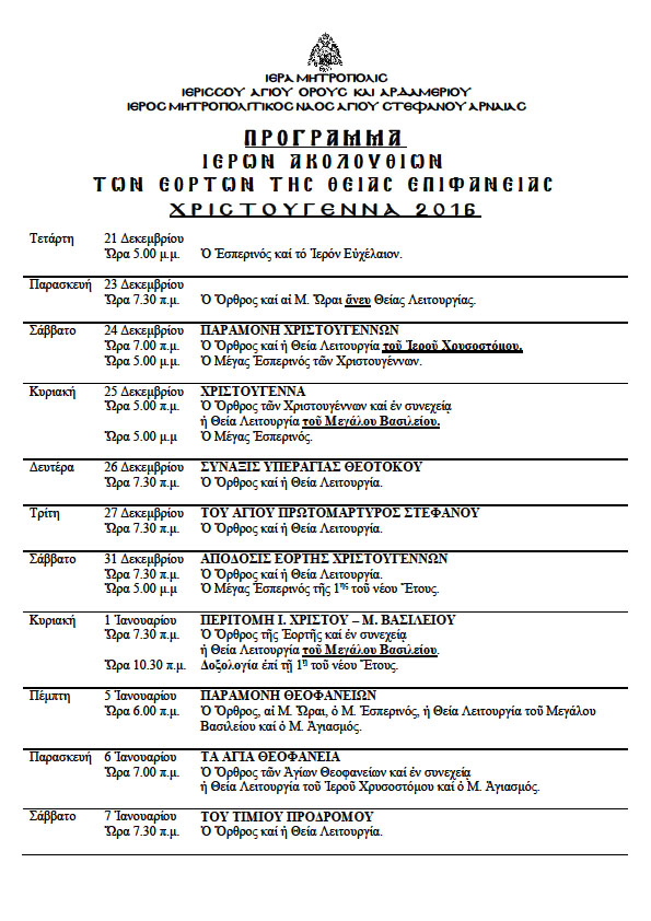 Οἱ Κατηχητικές Συναντήσεις τῶν Ἐνοριῶν τῆς Ἀρναίας ἔχουν τήν τιμή νά Σᾶς προσκαλέσουν στήν Χριστουγεννιάτικη Γιορτή πού διοργανώνουν, τήν Παρασκευή 23 Δεκεμβρίου 2016 στίς 6.00 τό ἀπόγευμα, στό Πολιτιστικό Κέντρο Ἀρναίας.